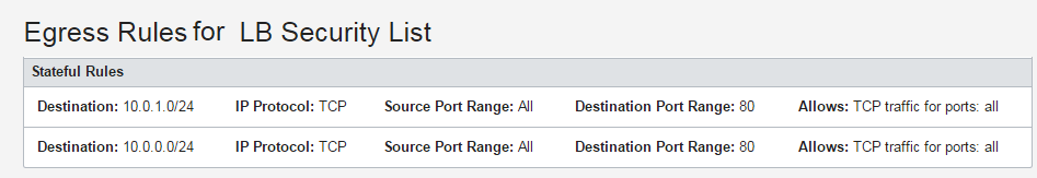 The system updates the security list used by your load balancer subnets to allow egress traffic from the load balancer to each backend server's subnet: