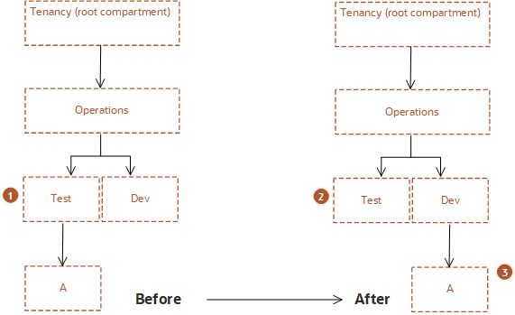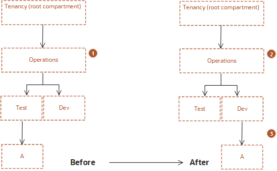 In this example, you move compartment A from Operations:Test to Operations:Dev. The policy that governs compartment A is attached to the shared parent, Operations. When the compartment is moved, the policy statement is automatically updated by the IAM service to specify the new compartment location.
