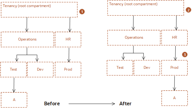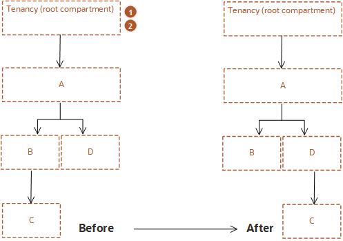 You can move a compartment to a different parent compartment within the same tenancy. When you move a compartment, all its contents (subcompartments and resources) are moved with it. Moving a compartment has implications for the contents. These implications are described in the following sections. Ensure that you are aware of these before you move a compartment.