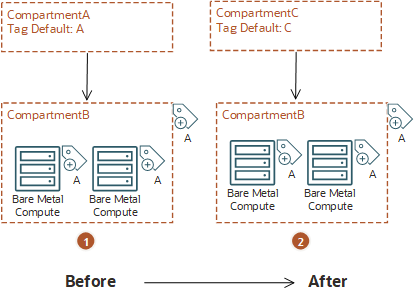 Tags aren't automatically updated after a compartment move. If you have implemented a tagging strategy based on compartment, you must update the tags on the resources after the move. For example, assume CompartmentA has a child compartment, CompartmentB. CompartmentA is set up with tag defaults so that every resource in CompartmentA is tagged with TagA. Therefore CompartmentB and all its resources are tagged with default tag, TagA. When you move CompartmentB to CompartmentC, it will still have the default tags from CompartmentA. If you have set up default tags for CompartmentC, you'll need to add those to the resources in the moved compartment.