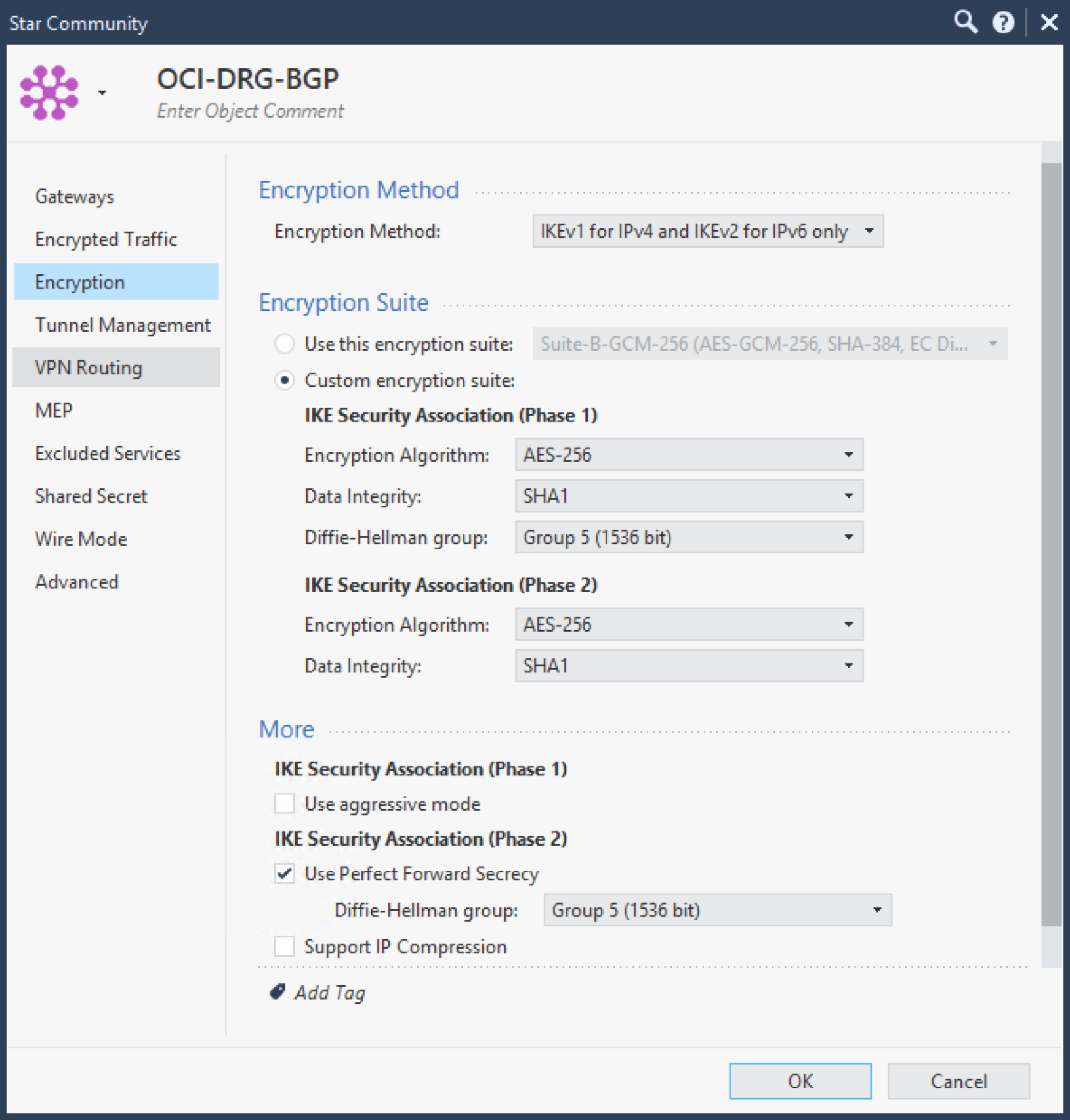 In this case, the VPN Community is OCI-DRG-BGP and the Internal_Clear is predefined by Check Point.