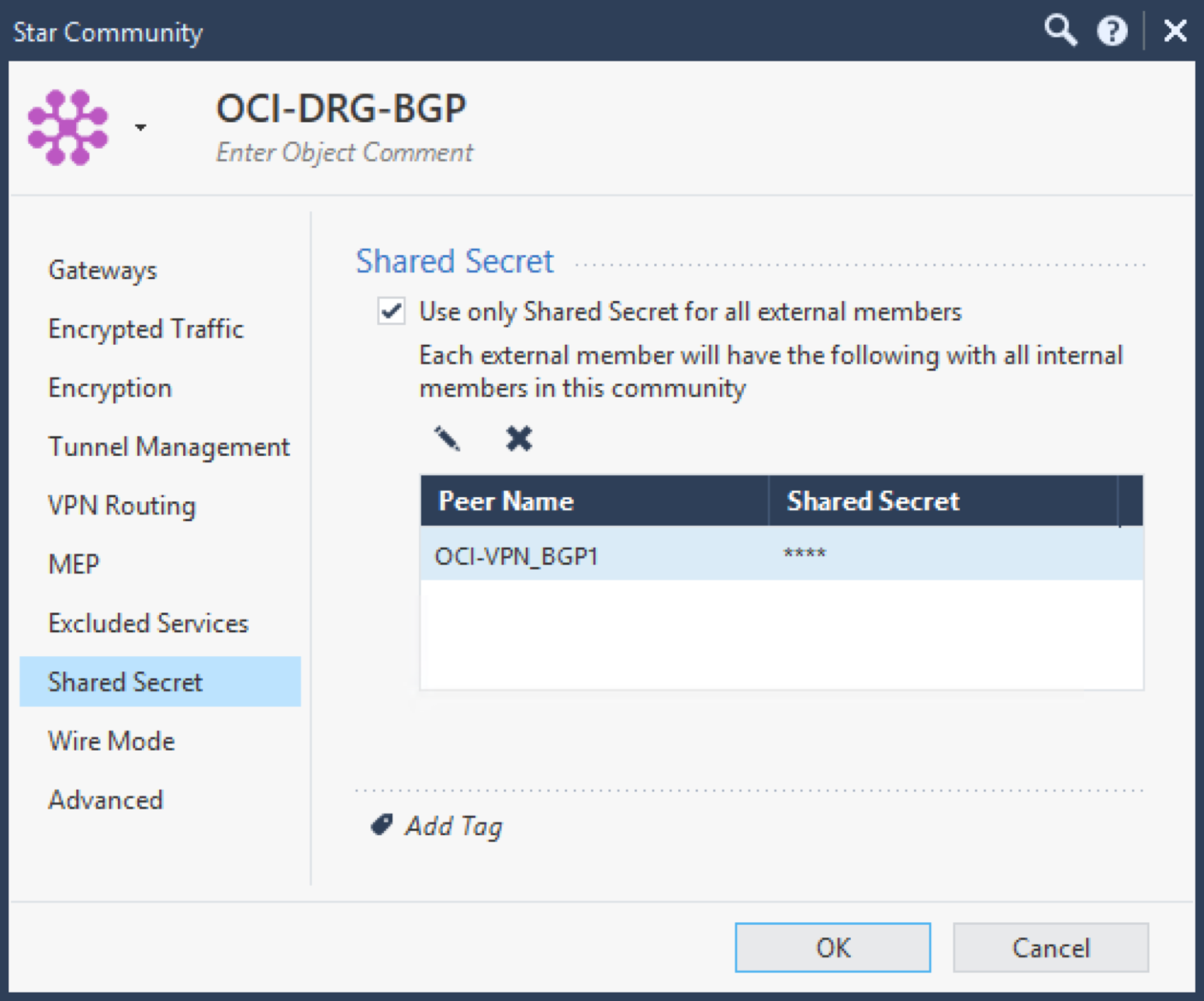 On the Shared Secret page, select Use only Shared Secret for all external members, and add the shared secret that Oracle generated for the tunnel when creating the IPSec connection.