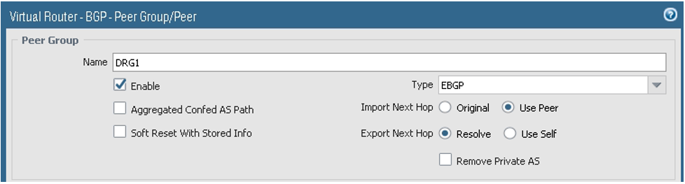 - Add the first Peer Group, and under the Peer Group Name, add the first session. Add the BGP session with the DRG.