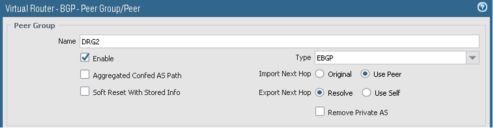 On the Peer Group tab, add the second Peer Group, and under the Peer Group Name, add the second session. Add the BGP session with the DRG.