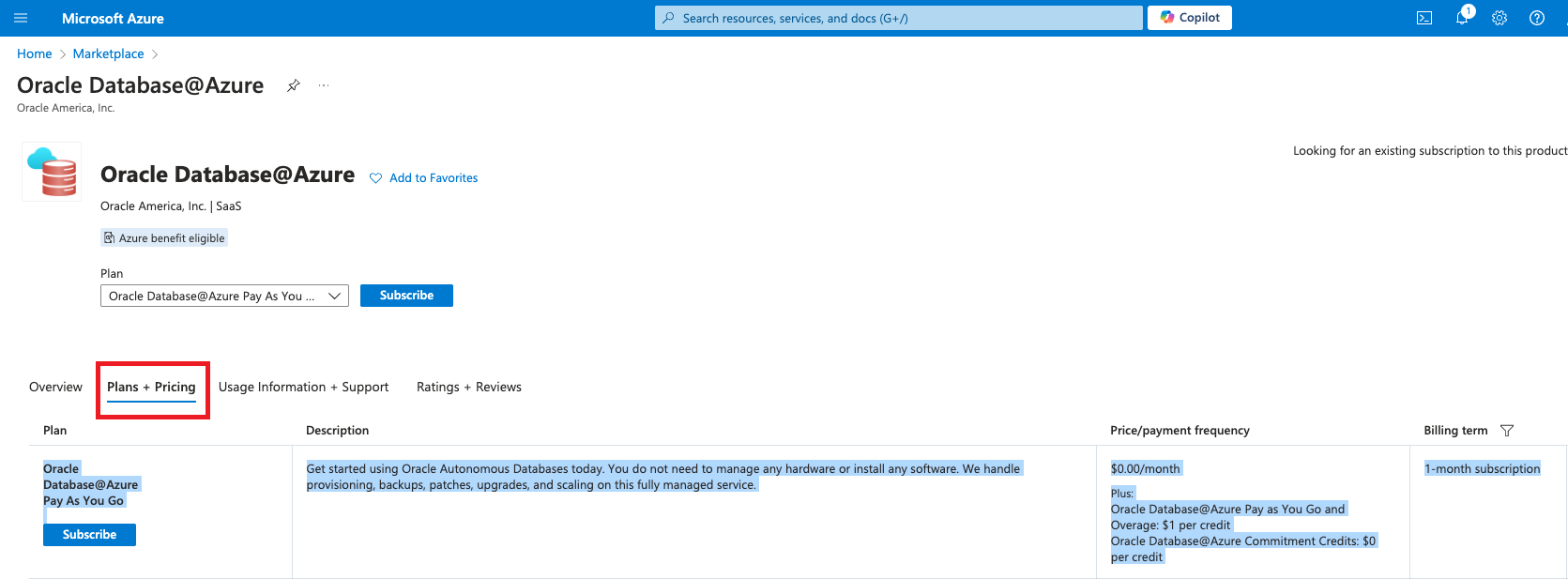 4. On the Oracle Database@Azure product page, review the information in the Overview, Plans + Pricing, and Usage Information + Support to ensure you understand the pricing, terms, and conditions. Then select Subscribe.
