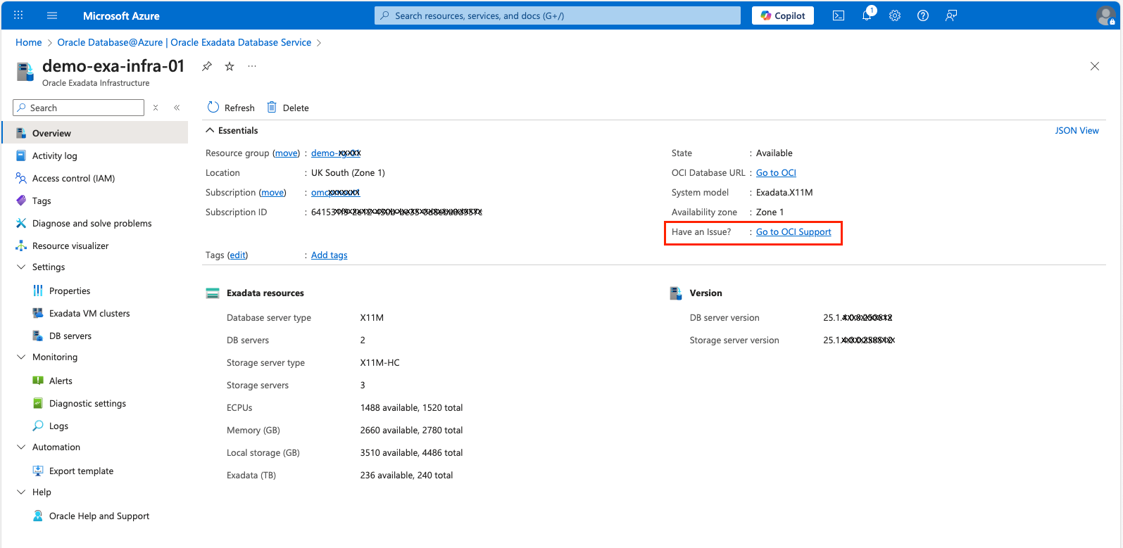 If you need to contact Oracle Support outside of the OCI Console, be sure to tell your Oracle Support agent that your issue is related to Oracle Database@Azure, as support requests for this service are handled by an OCI support team that specializes with these deployments. A member of this team will contact you directly.