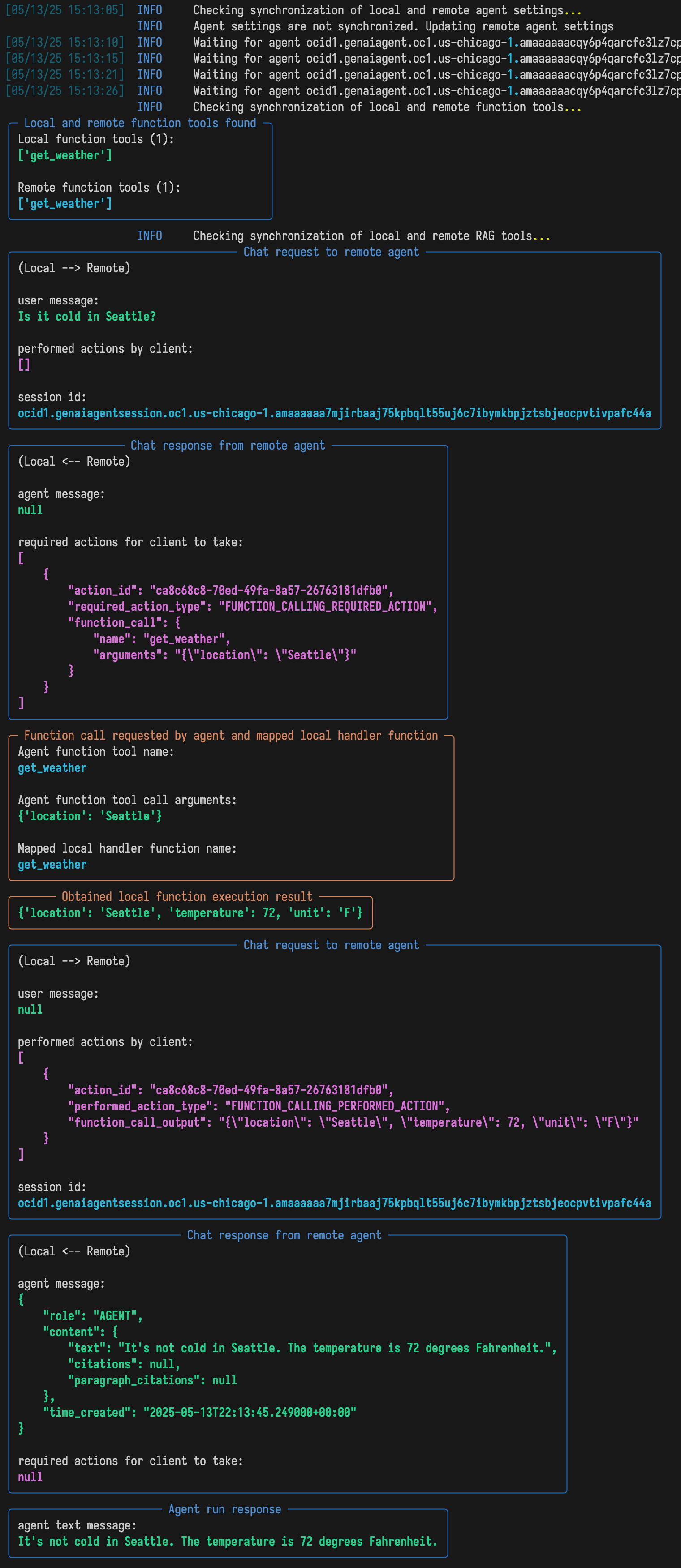 This agent is equipped with a local custom function tool get_weather that you implemented. The agent is ready to handle your user's request expressed in natural language.